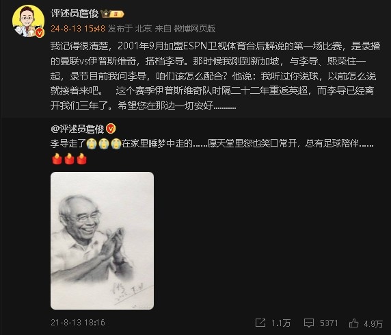 8月13日宣 今天是足球评论员李元魁过世三周年的日子,詹俊更新社媒表达追思之情。