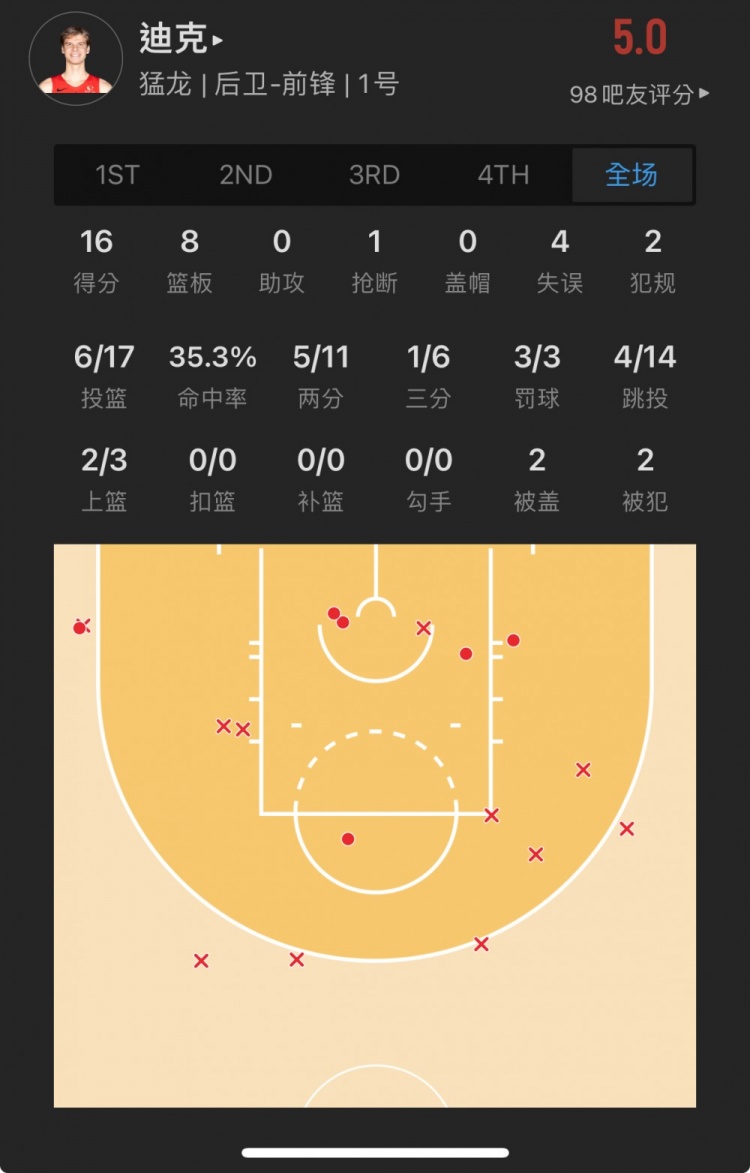 猛龙13号秀 格雷迪-迪克 出战33.8分钟