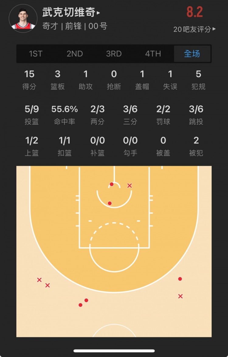 奇才42号秀 特里斯坦-武克切维奇 出战20.5分钟