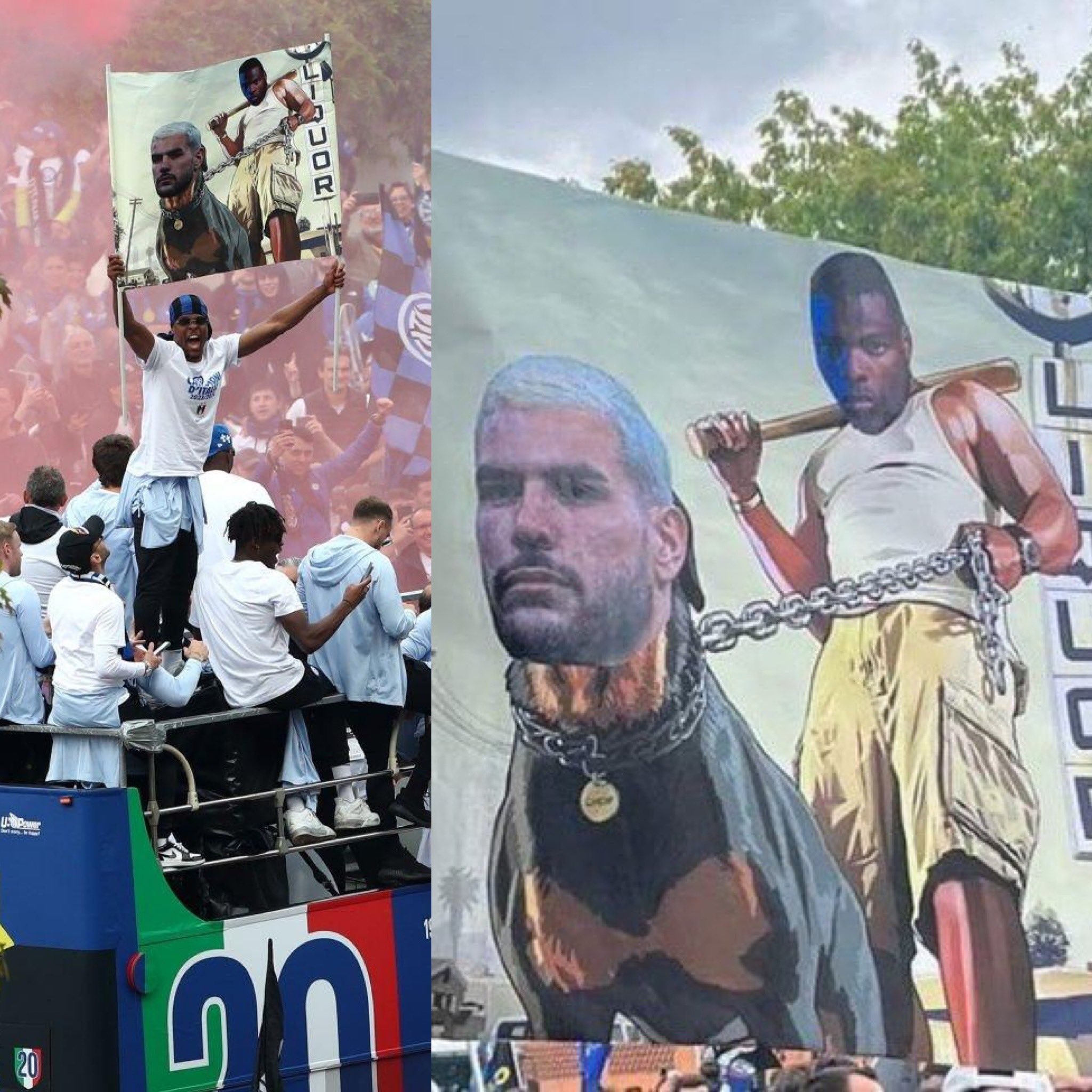 4月30日讯 在国米夺冠庆祝活动中,国米后卫邓弗里斯双手举起了一幅涉嫌侮辱米兰后卫特奥的旗帜。