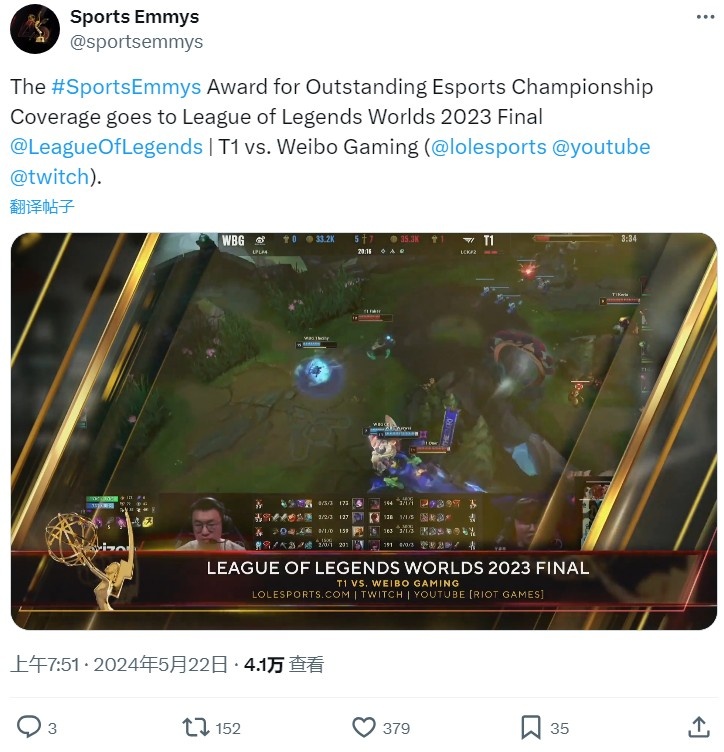 5月22日宣 第45届体育艾美奖公布“杰出电子竞技总决赛”奖项,该奖项获奖的项目为2023英雄联盟全球总决赛(T1 vs WBG)。