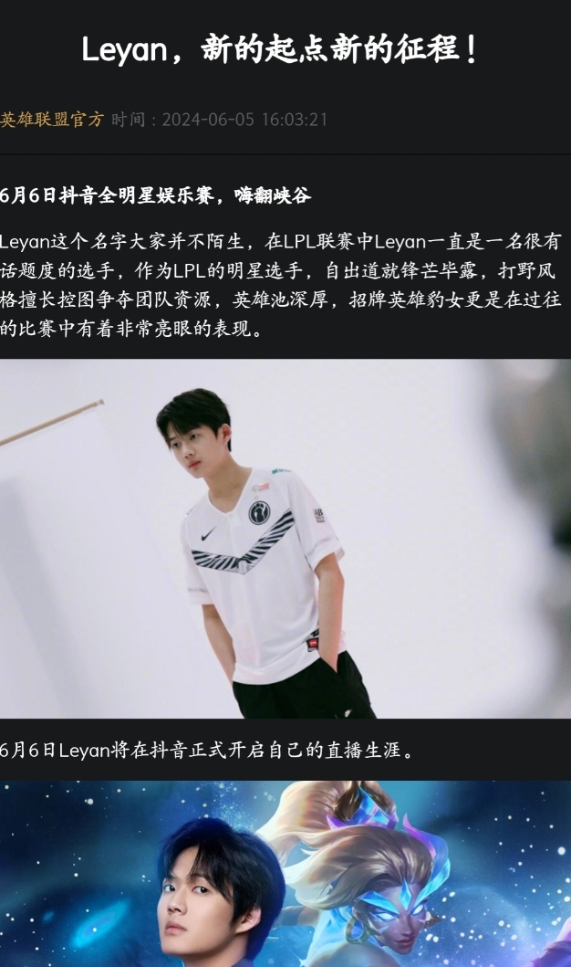 6月5日宣 今晚9点乐言将在抖音开启全明星娱乐赛,作为多次在LPL缴纳罚金的选手,本次直播可谓牌面拉满,LOL官网为其宣传!