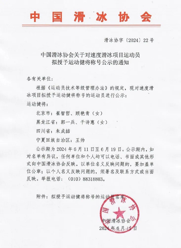 6月11日宣 中国滑冰协会公布了关于对速度滑冰项目运动员拟授予运动健将称号公示的通知,其中北京运动员崔智哲、顾艳青,黑龙江运动员郭一兵、于诗慧,宁夏运动员王帅,四川运动员朱成喆被拟授予运动健将称号。