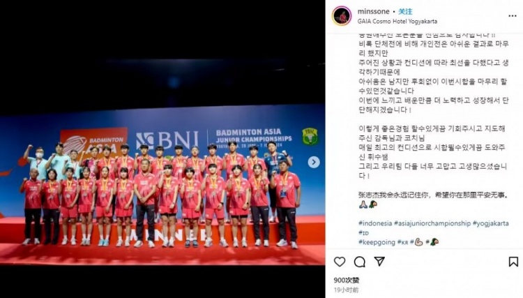 在本次比赛结束之后,韩国队羽毛球女单小将金敏煊更新了社媒,她用中文缅怀了不幸去世的张志杰,金敏煊写道:张志杰我会永远记住你,希望你在那里平安无事。