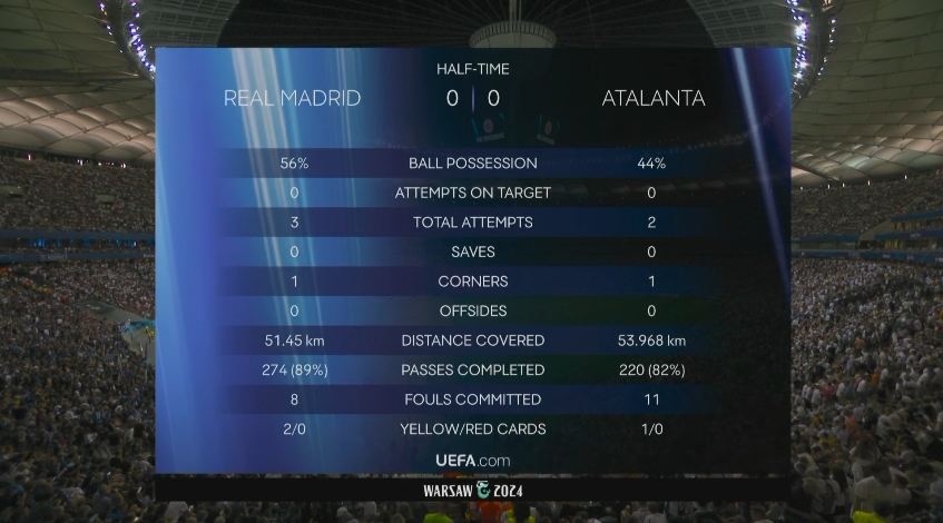 场面沉闷,皇马vs亚特兰大半场数据:两队均0射正