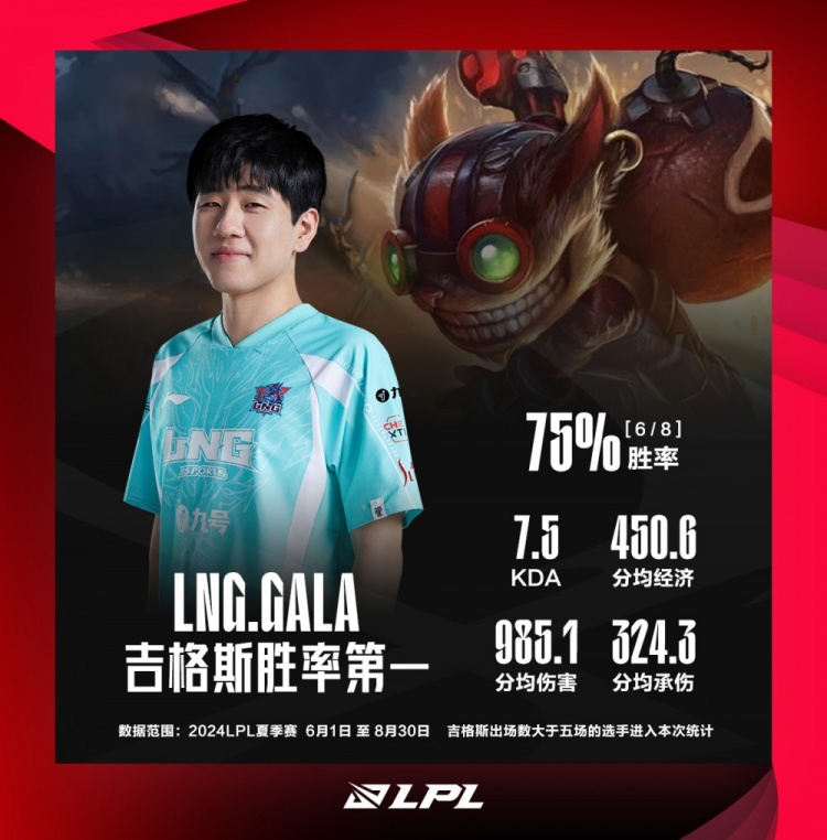 GALA选手共使用吉格斯8场,胜率达75%,是本赛季吉格斯胜率最高的选手。