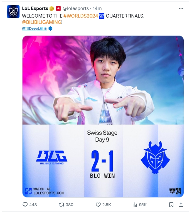 10月14日宣 BLG在瑞士轮出线生死战2:1淘汰G2,总战绩3-2成功晋级S14八强淘汰赛。