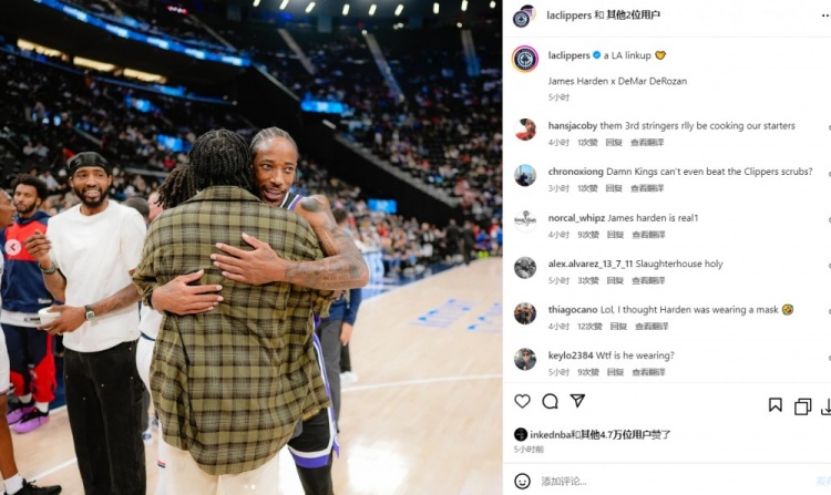 赛后德罗赞与本场未出战的哈登相互拥抱致意。