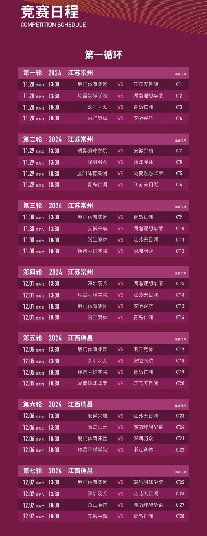 联赛第一站将于11月28日至12月1日在江苏常州的常州奥体中心体育馆举行,这里也是今年中国羽毛球公开赛的举办场地。四个比赛日将进行第1轮至第4轮的比赛。