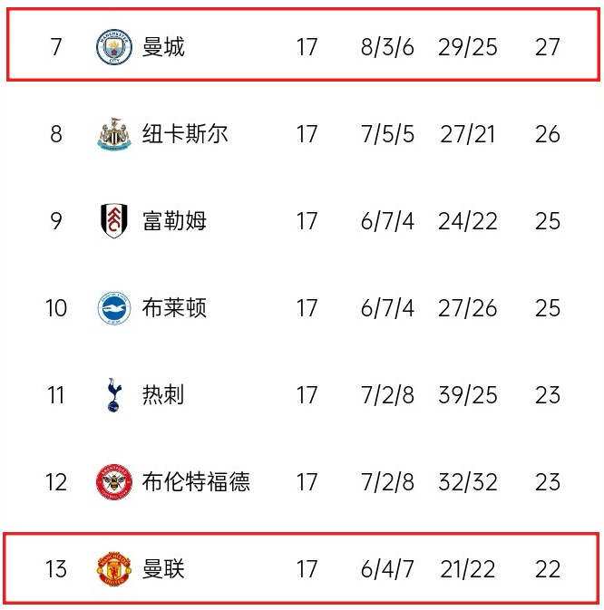 英超第17轮结束后,曼城第7,曼联第13,两队排名相差6名。