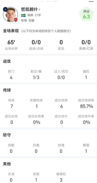 哲凯赖什在场上总共有着7次传球,其中6次成功,包括1次关键传球,传球成功率高达85.7%。在防守端,哲凯赖什的表现也颇为平淡,仅有1次解围。