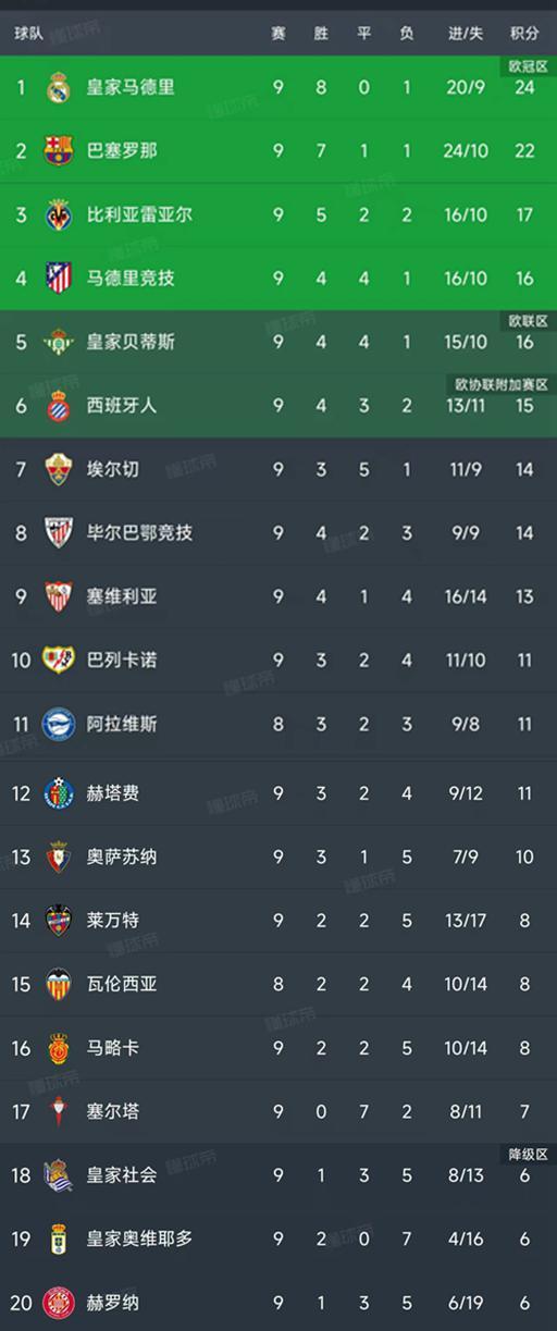 - 西甲 | 西甲第9轮结束了9场比赛,最新积分榜如下!