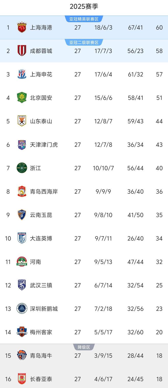 - 中超 | 中超27轮积分榜:11队积分突破30分,仅剩3队争冠,降级4选2