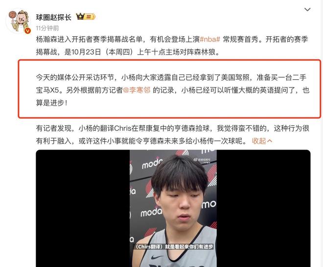 在这样的情况下,不管是开车去训练馆训练,还是外出吃饭或者娱乐。又或者带上女朋友去看场电影,其实都需要自己的交通工具。对于所有喜欢杨瀚森的球迷来说,看到小杨能够如此速度的融入当地的生活,应该会为他感到由衷的欣慰和开心。说实话,从最近一系列的细节可以感受到,杨瀚森和球队的队友相处还是相当愉快,而且教练组也很喜欢这名年轻球员,他本人的性格也比较活泼外向,很懂得自得其乐,这其实是非常难得的性格。再加上杨瀚森本身也具备一定的天赋,也愿意吃苦努力,我们相信他肯定可以在NBA闯出一片天。