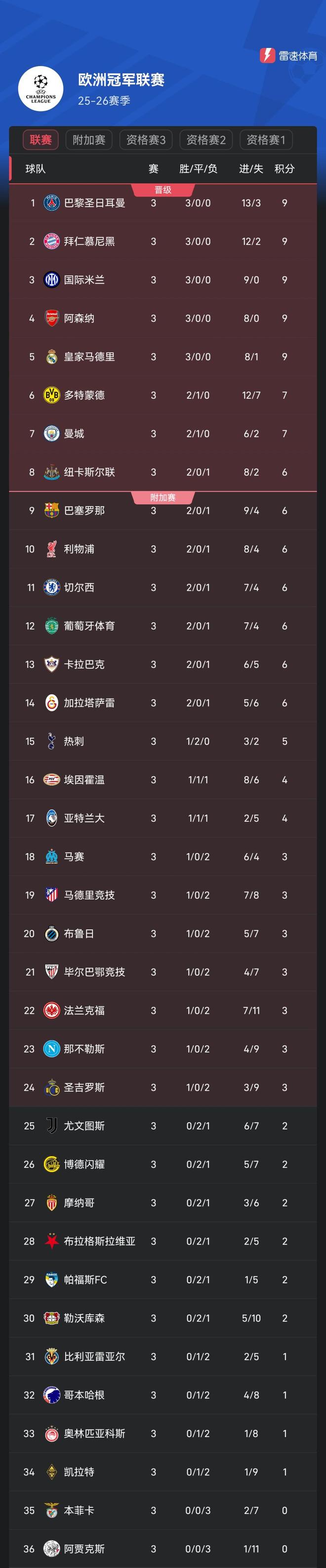雷速体育10月23日宣 欧冠联赛阶段第三轮在今天凌晨战罢,在最新积分榜上,巴黎、拜仁、国米、阿森纳、皇马5队保持3战全胜,巴黎凭借净胜球优势暂居榜首。