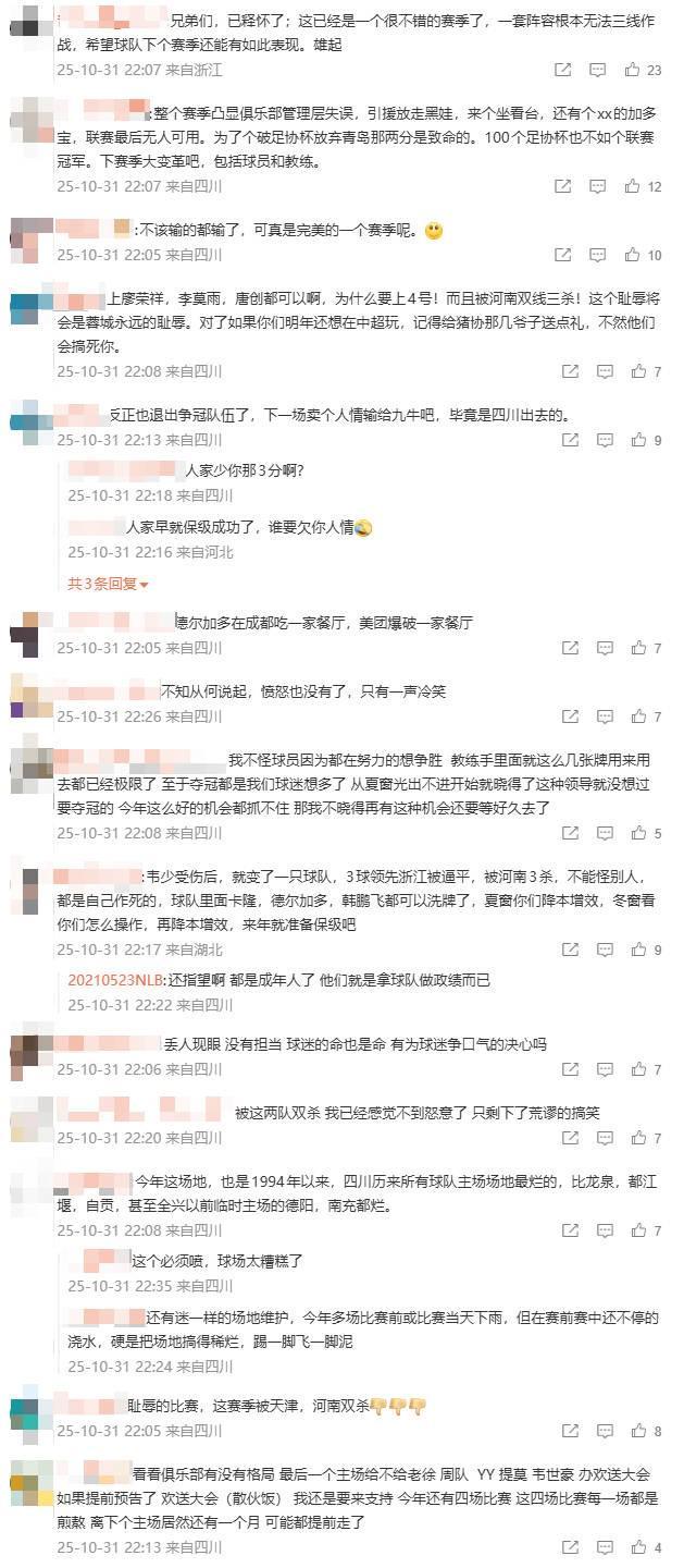 不过在这条动态下,许多球迷表达了对球队表现的不满,有人评论“失望”、“意难平”、“降本增笑”、“你们配不上成都这座城市和球迷,一次又一次往伤口撒盐”等,当然,也不乏一些鼓励的评论,如“希望下赛季还有这样的表现”、“下赛季加油”等。