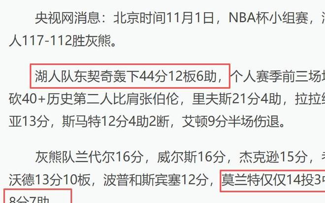 东契奇复出爆砍44+12+6莫兰特仅14中3NBA杯赛湖人力擒灰熊