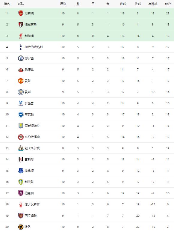 随着切尔西10热刺,阿森纳20,英超最新积分榜:利物浦20升第3
