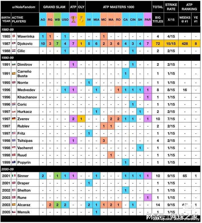 相比于阿卡,辛纳则是下半赛季全面飘红,毕竟,他正是在前年的加拿大大师赛首次拿下大师赛冠军。这样算来,意大利人夺得大师赛冠军的速度还是挺快的,要不是阿卡今年连夺三冠,还会被其压制一头。整体来看,辛纳除了在马德里还只是八强外,其余已经是全四强了。