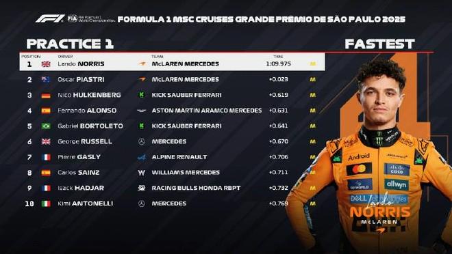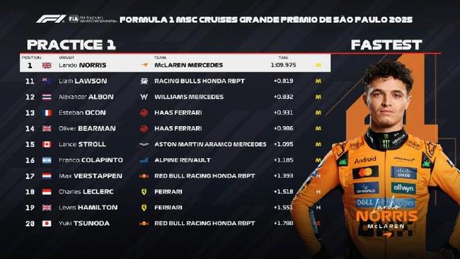 F1巴西站一练:迈凯伦全场最快,维斯塔潘第17,法拉利位列1819