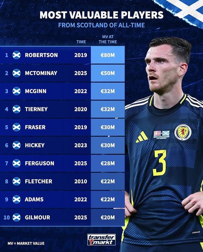 德转列苏格兰球员历史身价前10:罗伯逊8000万欧第1,小麦第2