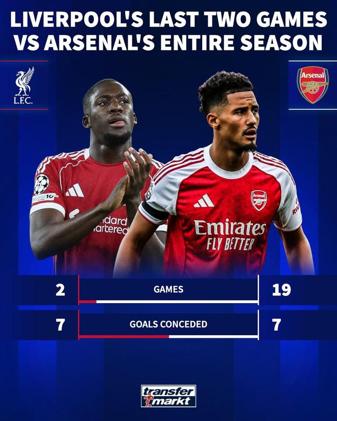 根据德国转会市场的统计数据,最近两场比赛,利物浦一共丢了7球(1-4不敌埃因霍温、0-3诺丁汉森林),而这两场比赛的丢球数和阿森纳本赛季19场比赛的丢球数一样多。