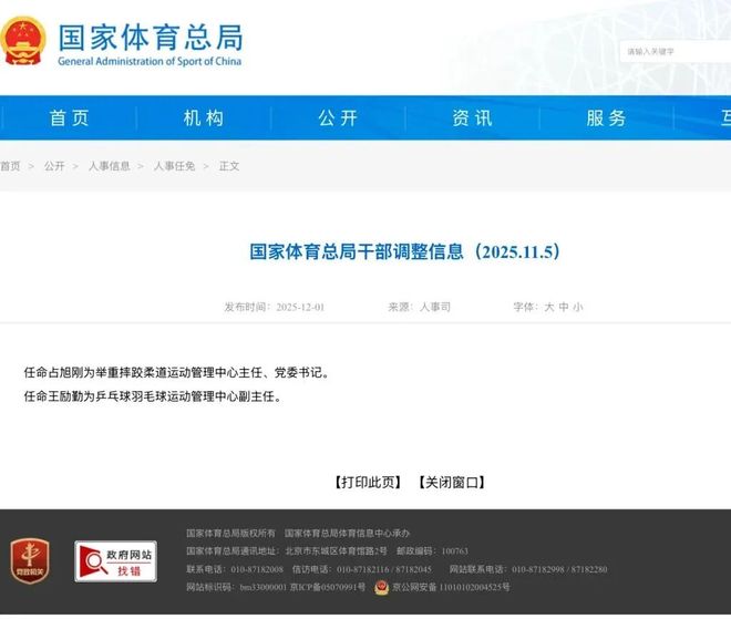 国家体育总局在其官网公布了干部调整信息