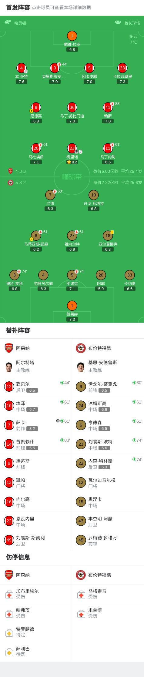 剑南春阿森纳20布伦特福德,梅里诺传射,萨卡替补建功