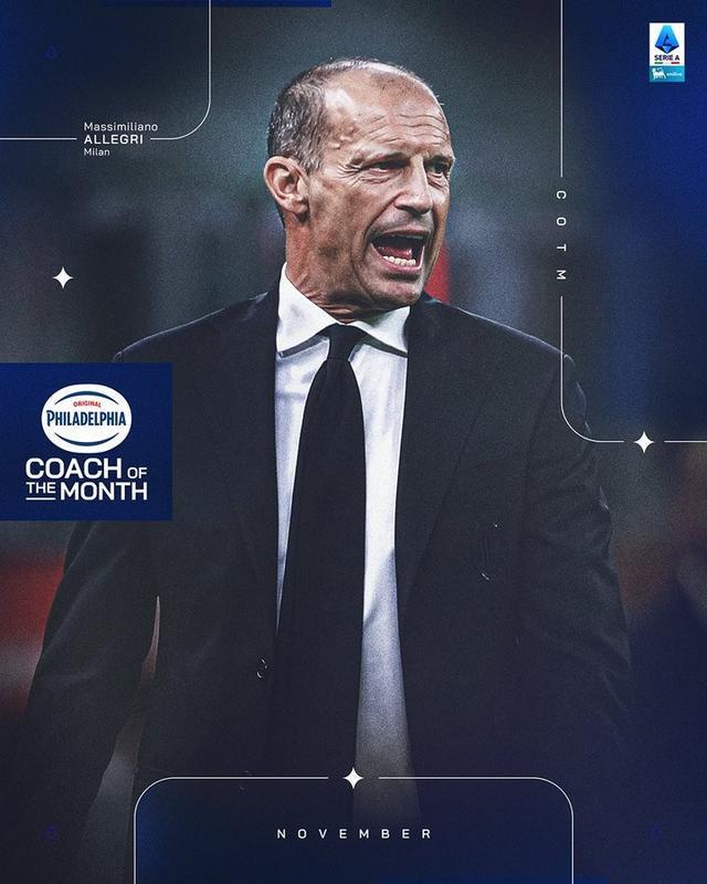 - 意甲 | 官方:AC米兰主帅阿莱格里当选意甲11月最佳教练