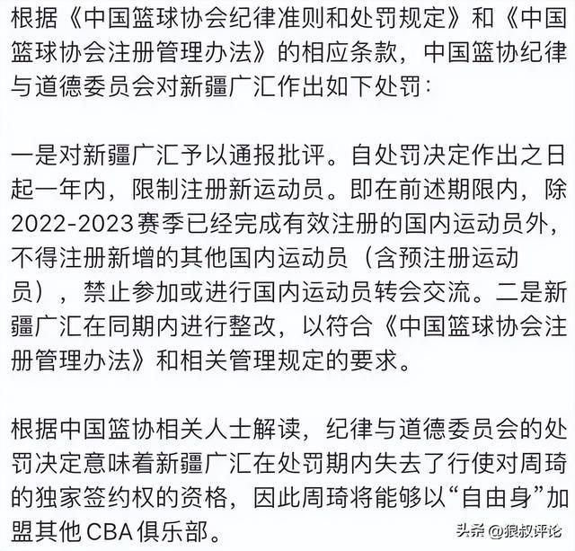 中国篮协发布对新疆广汇篮球俱乐部的处罚通知后,后者将会禁止注册球员,周琦重新获得自由球员的身份,自身能决定去哪儿打球。