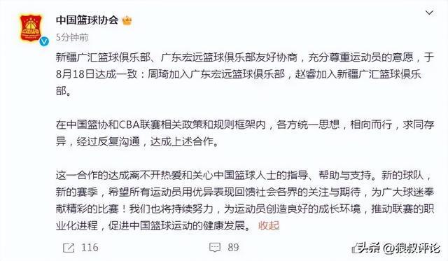 2023年8月份,男篮世界杯正式开打前,中国篮协推动了周琦、赵睿的互换,两人各自离开老东家的方式结束了这一场闹剧。