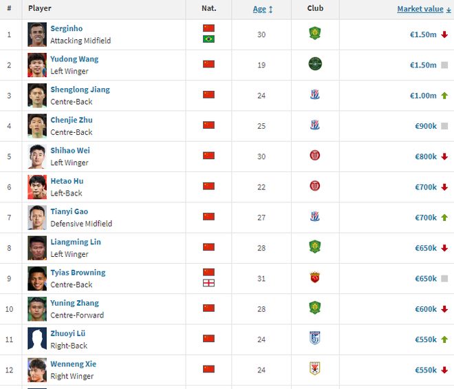 - 中超 | 中超国内球员身价前十:塞鸟、王钰栋150万欧居首,韦世豪第五