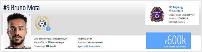 现年29岁的巴西前锋莫塔2025赛季加盟K联赛球队安养队,本赛季总共代表球队出战37场,攻进14球并送出3次助攻,进球数与朱玟奎并列射手榜第4。德转的最新信息显示,莫塔的身价仅为60万欧,仅为拉唐身价的五分之一。