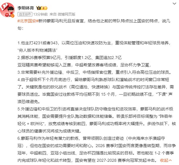 博主李明体育透露,“由于超级杯下个月月底进行,留给蒙哥马利熟悉球队和灌输战术的时间窗口非常短了。关键就是他的欧化战术(高位逼抢、快速转换)与国安传统传控打法存在差异,需要球员适应。毕竟国安过往教练平均任期不到15个月,一旦初期战绩不佳,下课声浪恐难避免。”
