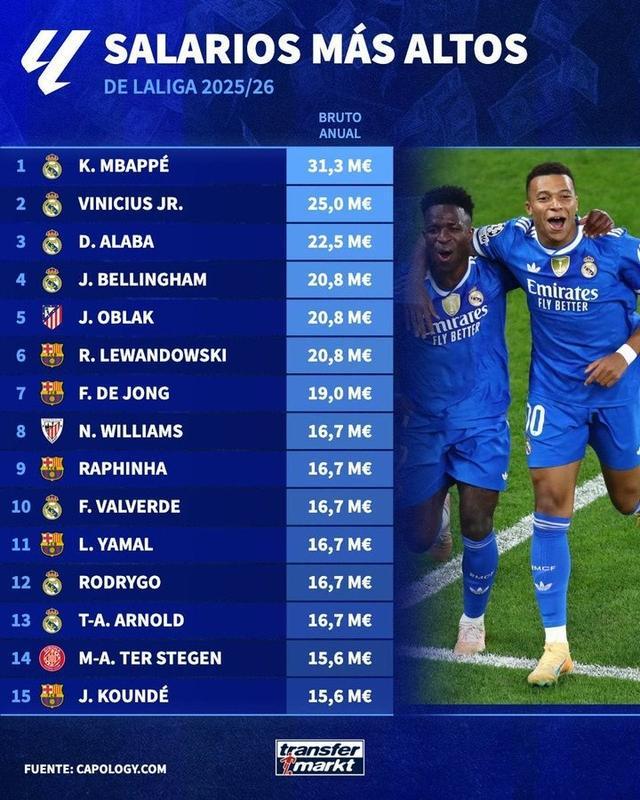 - 西甲 | 德转列西甲球员年薪榜:姆巴佩3130万欧居首,皇马包揽前四